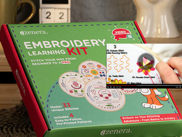 aZenera Embroidery Learning Kit for Beginners - Learn Different Stitches, Simple Patterns with Video Instructions | Includes Threads, Bamboo Hoop, 4 Cloth Fabric Designs, Tools (AZA100)